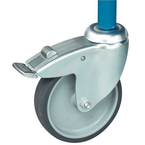 Robuste, structure mécano-soudée renforcée. Chariot pour bacs avec plateaux tôle solides. Réglage au pas de 100 mm.