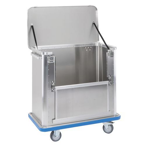 Chariot conteneur en aluminium pour une utilisation universelle. Hygiénique, sans odeur et ne rouille pas. Utilisation facile et ergonomique, même avec une charge maximale. Surface lisse, parois non nervurées permettant un nettoyage facile. Paroi rabattable maintenue en position ouverte grâce à deux aimants. Couvercle à charnières, 2 sangles de maintien et 2 fermetures à levier. Fond incliné avec 2 orifices d’évacuation, les deux orifices d’évacuation munis de soupape d’évacuation, bouchon et chaînette. Fond étanchéifié avec du silicone. Poignées anodisées sur les deux parois frontales.