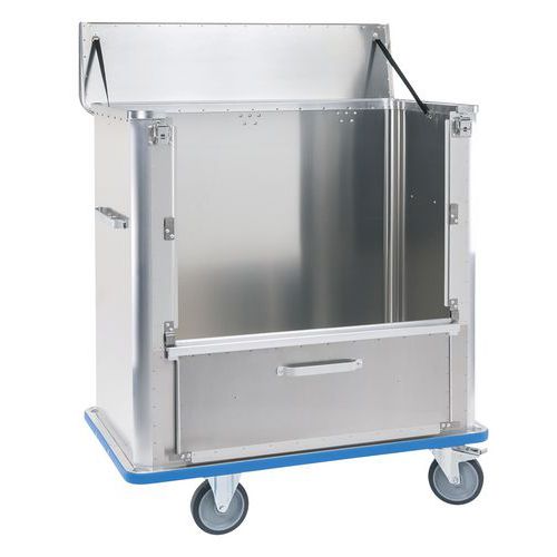 Chariot conteneur en aluminium pour une utilisation universelle. Hygiénique, sans odeur et ne rouille pas. Utilisation facile et ergonomique, même avec une charge maximale. Surface lisse, parois non nervurées permettant un nettoyage facile. Paroi rabattable maintenue en position ouverte grâce à deux aimants. Couvercle à charnières, 2 sangles de maintien et 2 fermetures à levier. Fond incliné avec 2 orifices d’évacuation, les deux orifices d’évacuation munis de soupape d’évacuation, bouchon et chaînette. Fond étanchéifié avec du silicone. Poignées anodisées sur les deux parois frontales.