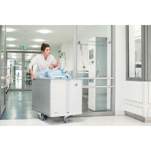 Chariot avec fond à déplacement vertical, maintient les produits toujours à hauteur de préhension constante. Grâce au fond vertical mobile, la marchandise est maintenu à la même hauteur. Confort de conduite élevé grâce à des roulettes souples à bandage en caoutchouc, qui ne laissent pas de traces, aux roulements à billes et aux écrans de protection. Disposition centrale des roulettes pour favoriser le rangement en espace étroit. Même en cas de chargement unilatéral du chariot, ce dernier ne bascule pas. Bord supérieur en profilé massif avec gainage synthétique. Roulements à rouleaux et pare-fils.