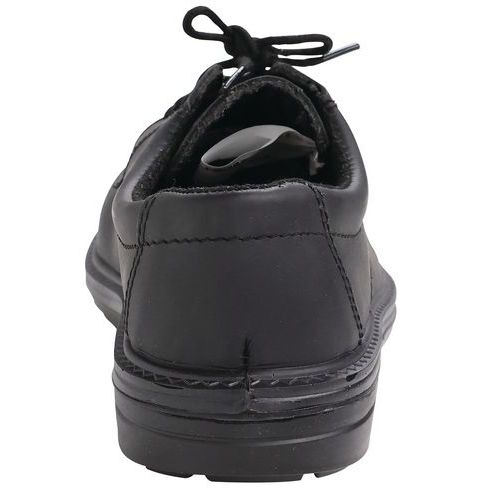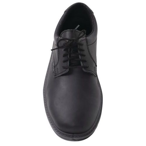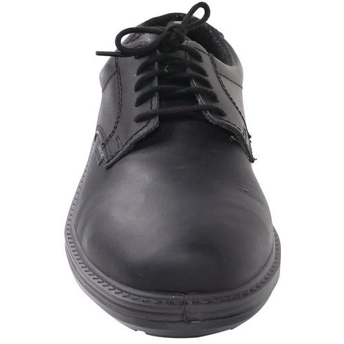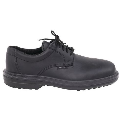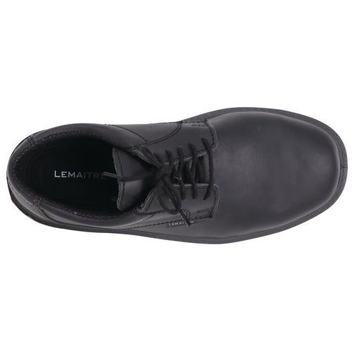 Derby de sécurité en cuir pleine fleur hydrofuge avec oeillets invisibles et lacets ronds ton sur ton Doublure en fibres absorbantes hygiéniques Modèle 0% métal, idéal dans les zones équipées de détecteurs de métaux (aéroports, entrepôts) Semelle anti-dérapante au pourtour biseauté rendant les crampons invisibles Chaussant large et confortable, très grand confort, absorbeur de chocs au talon et talon décroché