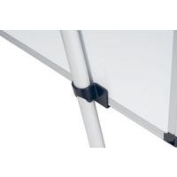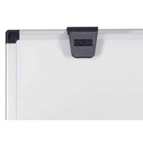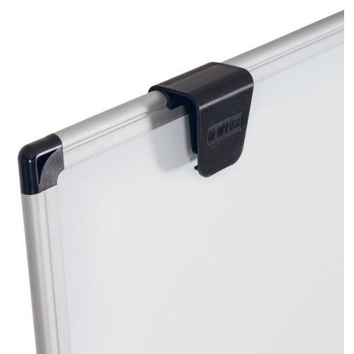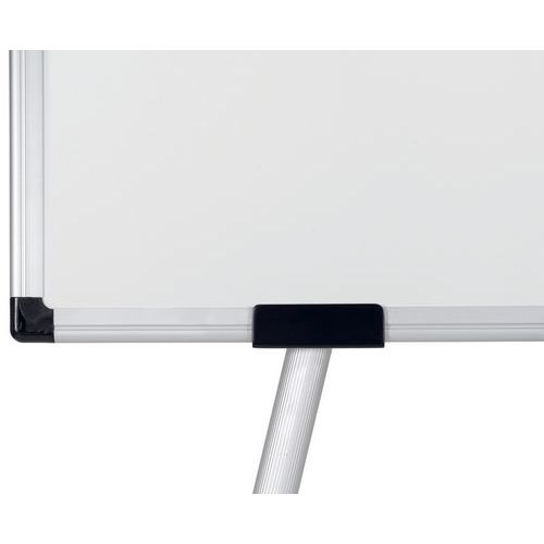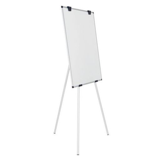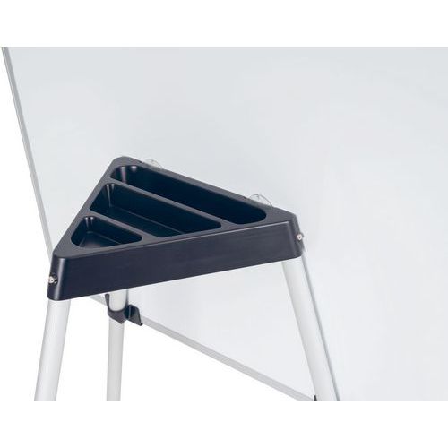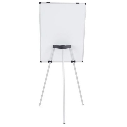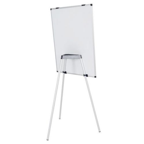 Tableau blanc magnétique 100x70cm, trois pieds en aluminium, base centrale en plastique qui sert également d'auget pour ranger les accessoires, crochets pour blocs de papier, notice de montage.