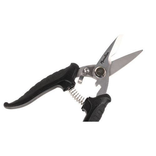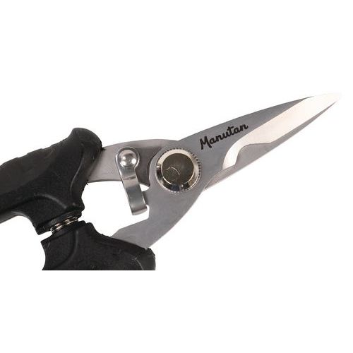 - Cisaille coupe-tout avec lames droites épaisses et effilées dont une crantée.