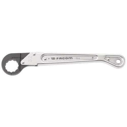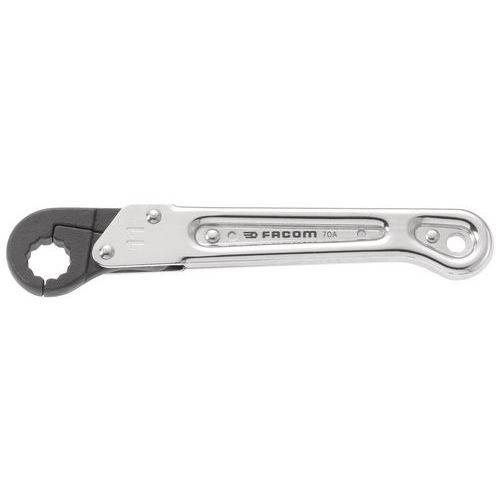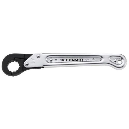 Clé à tuyauter à cliquet : la clé s'ouvre pour passer autour du tuyau et se referme sur l'écrou pour une prise optimum. La forme spéciale de la clé permet un effet cliquet. Serrage rapide sur toutes les canalisations en automobile, poids lourd, travaux publics, compresseurs, réfrigération, aéronautique, sanitaire. Tête 6 pans : de 7 à 10 mm - Tête 12 pans : de 11 à 32 mm. Trou d'accrochage en bout de manche : rangement des clés sur panneau ou accrochage pour éviter la perte ou la chute. Dimensions métriques : de 7 à 32 mm. Présentation : manche chromé satiné / tête brunie.