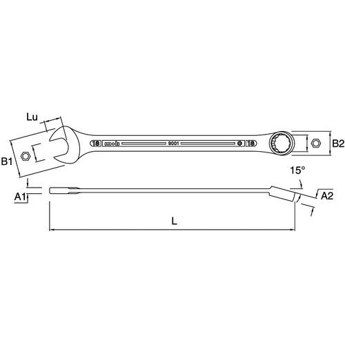 Clé mixte longue. angle de reprise de 30 degrés. diamètre extérieur de la tête œil réduit pour un travail en zones encombrées. inclinaison de 15 degrés entre tête et corps pour utilisation en milieux étroits. corps ergonomique pour bonne prise en main.