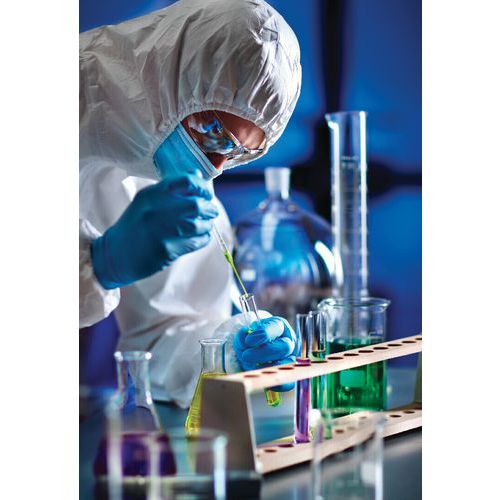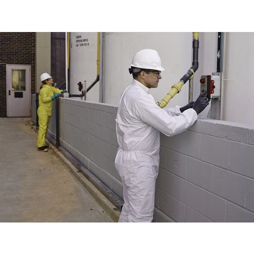 Comporte une barrière en matériau non tissé SMMS, protégeant contre les particules, les pulvérisations et les éclaboussures de liquides ininflammables.