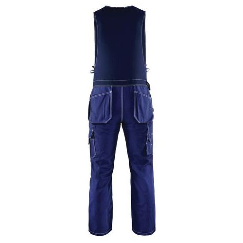 Point fort: Dos stretch. Détails: Boucle porte-marteau latérale. Boutons métalliques. Couture entrejambe renforcée. Réglable au niveau des coutures des épaules. Triple couture à l'entrejambe. Poches: Poche jambe avec poche stylos, poche téléphone et poche pour badge identifiant. Poche mètre avec porte couteau et poche stylo. Poche téléphone. Poches avant à soufflet. Poches flottantes à l'arrière. Poches flottantes renforcées escamotables dans les poches avant à soufflet. Poches genouillères avec deux niveaux de placement possibles. Poches poitrine flottantes avec boutons-pression et sangles de sécurité, une à rabat et une avec poche stylos, boutons jean et porte-couteau. Fermeture avant: Fermeture éclair plastique recouverte sur un côté. Renforcement: Renforts CORDURA® au niveau des poches genouillères et des poches arrière. Certification: EN 14404 avec protections genoux certifiées EN14404, art 4000, 4008, 4018.