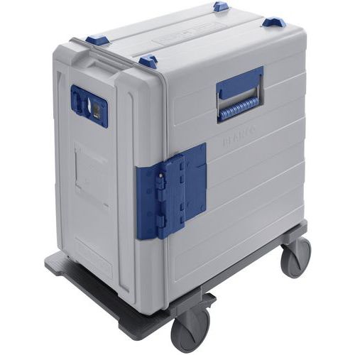 BLANCOTHERM 620 KBRUH-F avec goulotte à condensat Conteneur de transport de repas en polypropylène, chauffé par air pulsé, avec régulateur de température numérique pour la régulation au degré près de la température dans l’espace intérieur de +40 °C à +85 °C, mobile, avec roues conformes DIN 18867-8 en plastique, 4 roues pivotantes, dont 2 avec frein, avec porte battante Capacité : 3x GN 1/1-150 ou leurs subdivisions Nombre de glissières : 12 paires de glissières Espacement des glissières : 39 mm Fabriqué en Allemagne