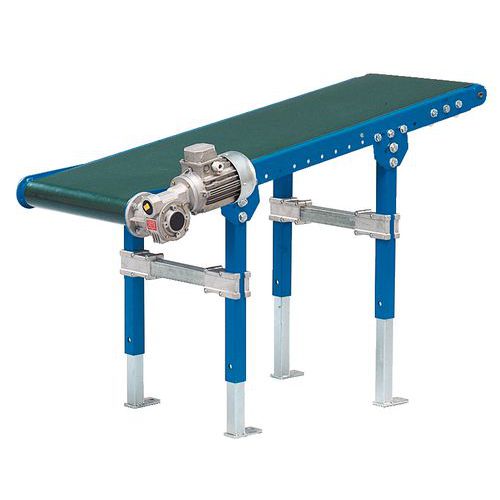 Convoyeur à bande motorisé pour charge jusqu'à 15 kg/m. L’entraînement de la bande est effectué par un tambour de commande. Motoréducteur à vitesse fixe monté en tête sur le côté, 240/400 V TRI, (IP55). Bande vulcanisée sans fin en PVC lisse verte.
