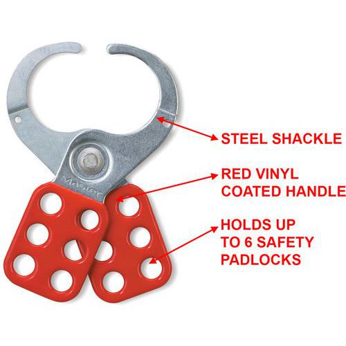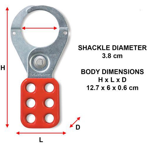 - Le crochet de consignation en acier Master Lock nº 421 présente un diamètre intérieur de mâchoire de 38 mm et peut accueillir jusqu'à six cadenas.