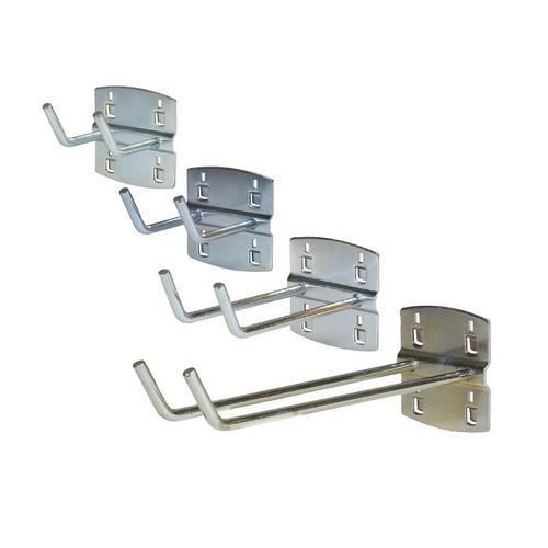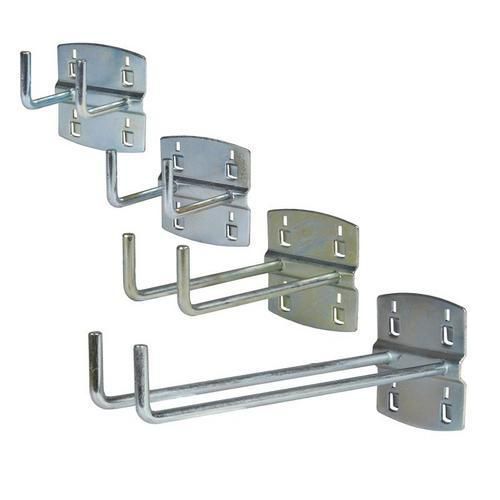 Porte-outils doubles en tôle galvanisée et fil dia. 5 mm ont un angle de courbure de 0°. Inclus sont des dispositifs de sécurité en plastique contre les supports tombant du panneau perforé.