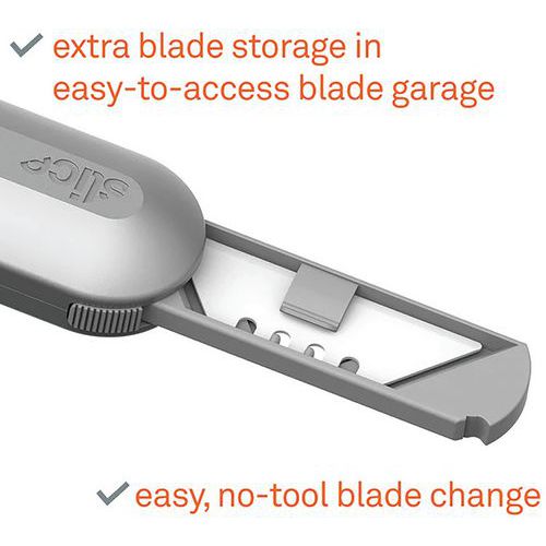 - Vous pouvez ranger une lame supplémentaire dans l'espace pratique à l'arrière du manche.