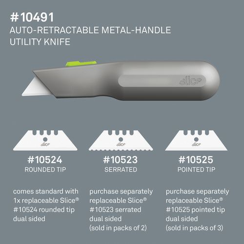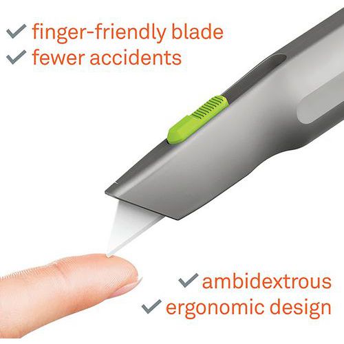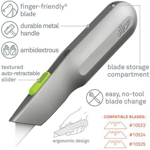 - La lame à pointe arrondie se rétracte automatiquement lorsque le curseur est relâché, vous assurant ainsi votre sécurité au travail.