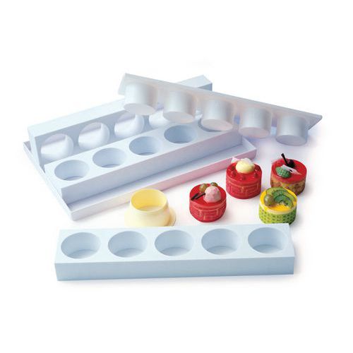 Chaque démouleur permet d'éjecter simultanément 5 gâteaux ou 4 pour le triangle, sans les deteriorer. Dim. : 400 x 100 mm. Montage rapide de gâteaux et mini-gâteaux individuels : mousses, charlottles, entremets, vacherins… Les opérations de garnissage, de lissage et les manipulations sont facilitées et plus rapides. Les démouleurs facilitent l'extraction instantanée des gâteaux , gain de temps. Utilisables dans les chambres froides négatives (congélateurs). Livrés avec Plaque support. Polystyrène, blanc. Fabriqué en UE