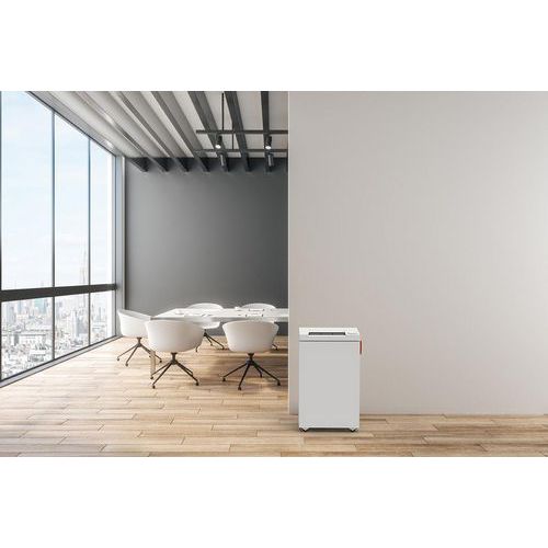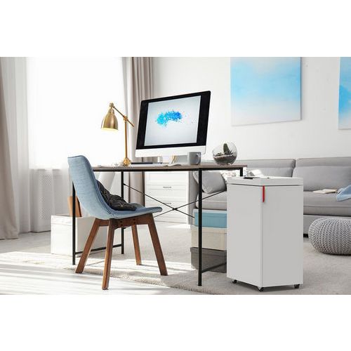 Destructeur de document avec système de protection et de sécurité. Smiley lumineux indiquant la capacité maximale du destructeur, évite les bourrages. Bloc de coupe en acier spécial, robuste et sûr acceptant Carte bleu et trombone. Marche/arrêt automatique par cellule. Meuble bois avec porte, monté sur roulettes. Réceptacle pratique avec poignée de préhension. Idéal pour le télétravail