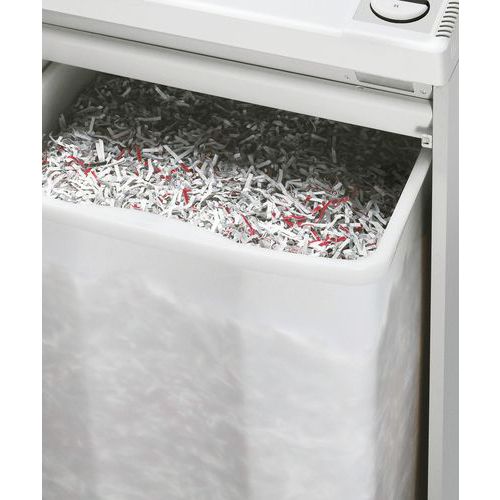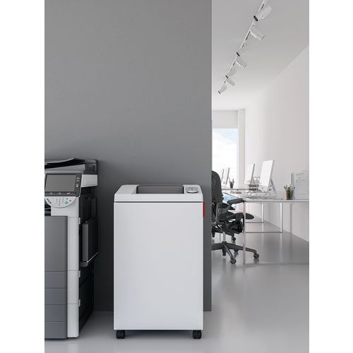 Détruit également les CD/DVD, cartes de crédit et agrafes. Retour et blocage automatiques en cas de bac collecteur plein (prévient le bourrage de papier). Double sécurité du moteur contre la surchauffe, ciseaux de coupe de qualité supérieure en acier trempé. Économe en énergie et démarrage/arrêt automatique par cellule photo-électrique. Système de protection et de sécurité avec retour automatique et arrêt en cas de surépaisseur. Avec Safety Protection System : clapet contrôlé électroniquement avec ouverture d'alimentation comme élément supplémentaire de sécurité.