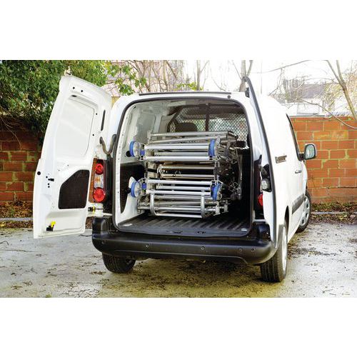Échafaudage roulant, compact et télescopique formé d'une pièce. Système d'accès en hauteur innovant, très résistant, polyvalent. Déploiement et installation très simple et ultra-rapide (3 minutes). Encombrement réduit pour transport aisé avec un petit utilitaire. Roues de grand Ø réglables en hauteur avec système de blocage. Produit fabriqué en France. Garantie client : 2 ans Charge maxi (kg) : 200