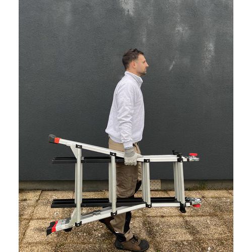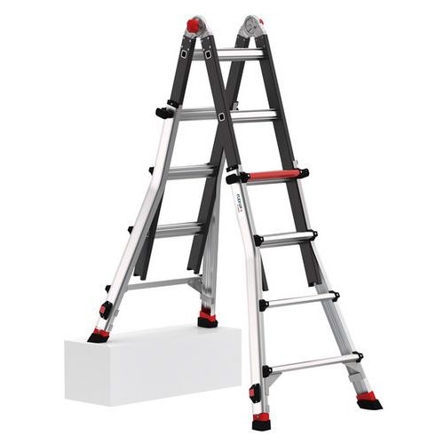Échelle 4x4 multi-positions avec 2 pieds indépendants réglables et 2 plans réglables en décalage de niveau.