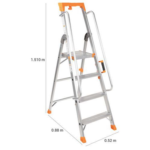 Escabeau professionnel aluminium. Tablette porte-outils multifonction. Confortable et sûr avec rampe. Profils renforcés aluminium. Système de vérouillage de la plateforme. Marches antidérapantes. Facile à transporter, à ranger. Garantie client : 10 ans Charge maxi (kg) : 150 kg