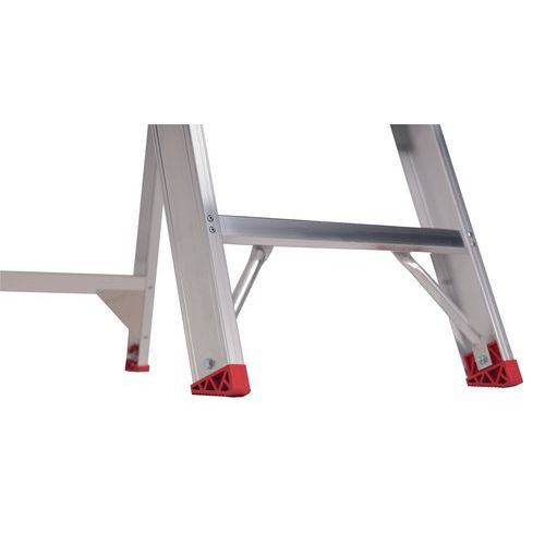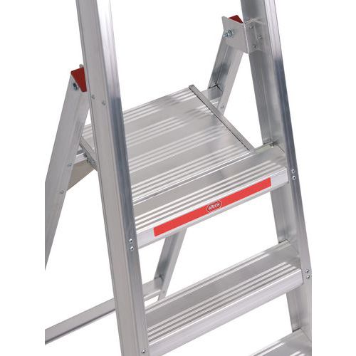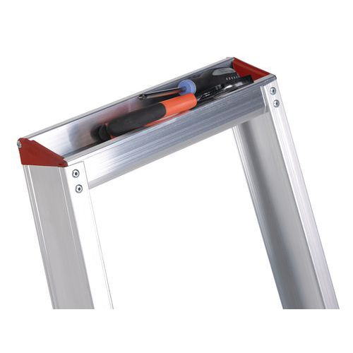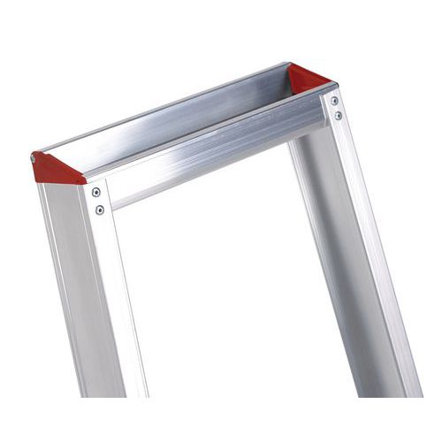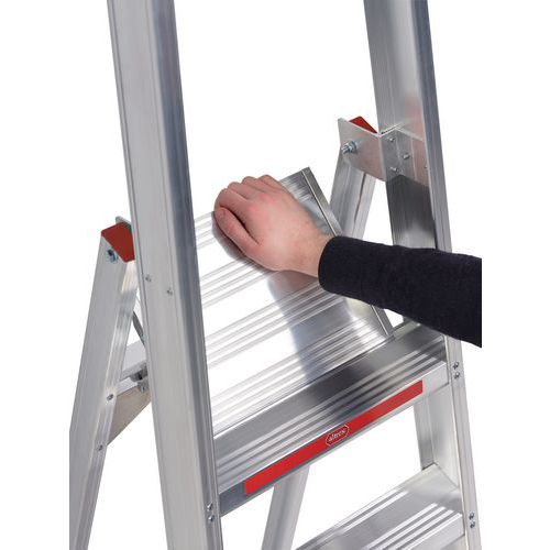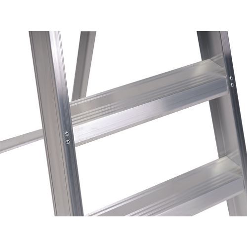 Escabeau professionnel simple accès en aluminium extrêmement léger avec des marches à profil creux. Les marches sont fixées à l’aide de rivets tubulaires. Ainsi, elles peuvent être remplacées rapidement en cas de besoin. Repliez et dépliez l'escabeau de manière rapide et aisée grâce au système de charnière auto-verrouillant sur la plate-forme.