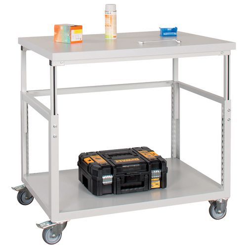 Établi équipé de 4 roulettes, dont 2 roues pivotantes avec frein.