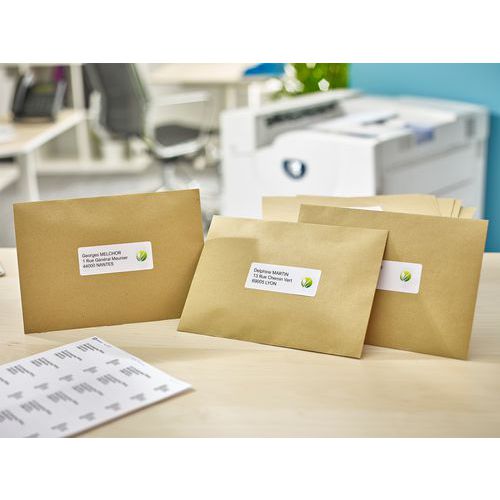 Étiquette recyclée blanchie sans chlore, facile à décoller de leur support. Compatible toutes marques d'imprimantes laser. Coins ronds.