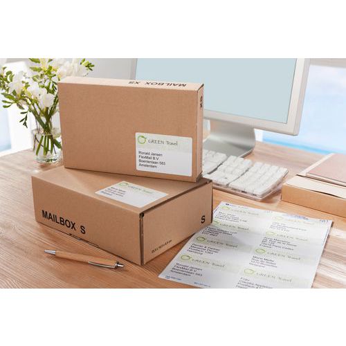 Étiquette recyclée blanchie sans chlore, facile à décoller de leur support. Compatible toutes marques d'imprimantes laser. Coins ronds.