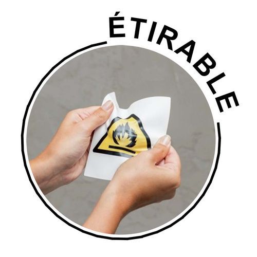 Étiquette souple à fort pouvoir adhésif, résistante aux conditions extrêmes. Matière étirable: convient pour un marquage sur des surfaces incurvées et/ou rugueuses. Résiste à des températures de -40°C à + 150°C, aux salissures, produits chimiques, solvants, rayons UV. Certifiée BS5609 Partie 2 (résistance de l’étiquette et de l’adhésif), et approuvée pour l’étiquetage de produits chimiques dangereux. Compatible toutes imprimantes laser, jet d'encre ou copieurs.