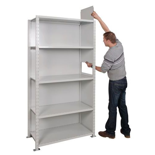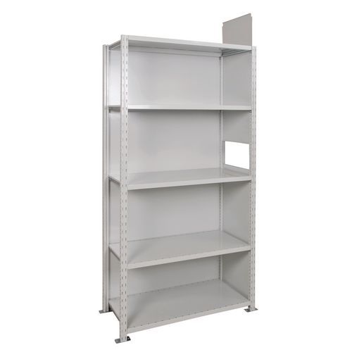Solide panneau arrière tôle pleine galvanisée. Stabilise et renforce la structure du rayonnage. À insérer dans les montants à l’aide des crochets. Époxy gris clair, RAL 7035.
