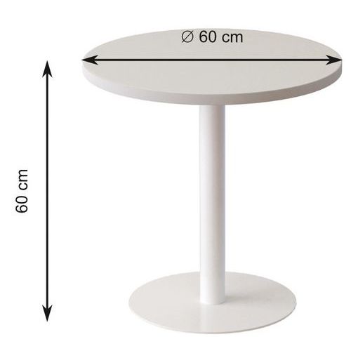 Plateau mélaminé épaisseur 25 mm avec chant ABS 2 mm Plateau diamètre 60 cm Pied acier laqué époxy blanc antirayure. Piètement central sur socle acier laqué époxy blanc anti-rayure. Socle Ø 49,5 cm, épaisseur 4 mm. Livré prêt à monter avec notice.