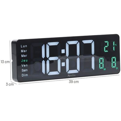 | Intitulé du produit | Horloge murale LED rectangulaire, Horloge affichage: Numérique, Forme: Rectangle, Coloris: Noir |