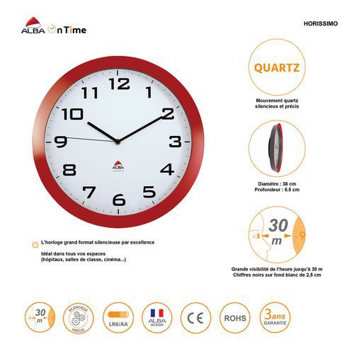 Horloge quartz ronde Ø 38 cm Alba, Horloge affichage: Analogique (à aiguilles), Forme: Rond, Coloris: Rouge