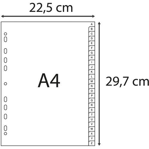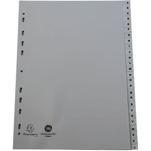 | Intitulé du produit | Intercalaire imprimé alphabétique, Nb de divisions: 20, Coloris: Gris, Pour format: 210 x 297 mm (A4) |