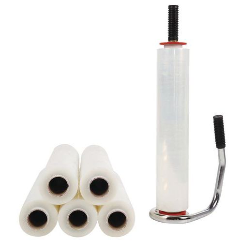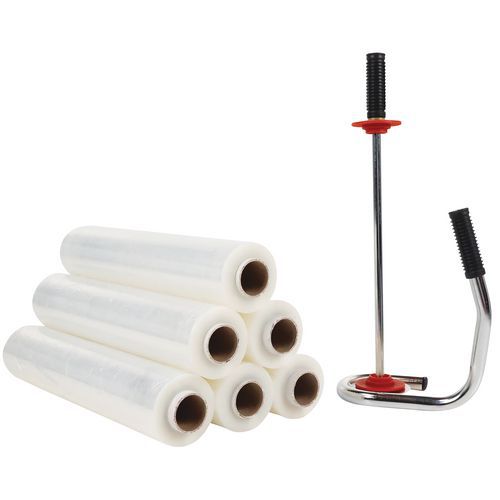 | Intitulé du produit | Kit film étirable transparent avec dérouleur métallique, Épaisseur: 20 µm, Longueur: 300 m, Laize: 500 mm |