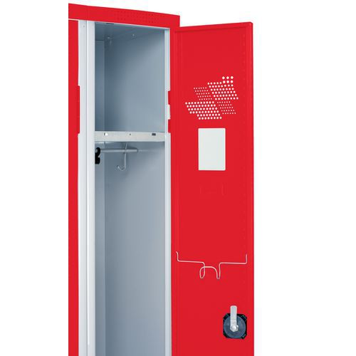 Vestiaire en tôle d'acier 1er choix, de belle rigidité, indéformable. Tôle d'acier 6/1e profilée (équivaut à pliage standard 8/1e). Colonnes soudées entre elles pour une plus grande solidité. Excellente résistance mécanique avec profil fermé agrafé. Porte indégondable ouverte ou fermée, antieffraction. Articulation sur charnières avec ouverture à 18°. Armoire vestiaire avec porte-étiquette embouti. Alliez résistance, sécurité, esthétique pour vos espaces collectifs !