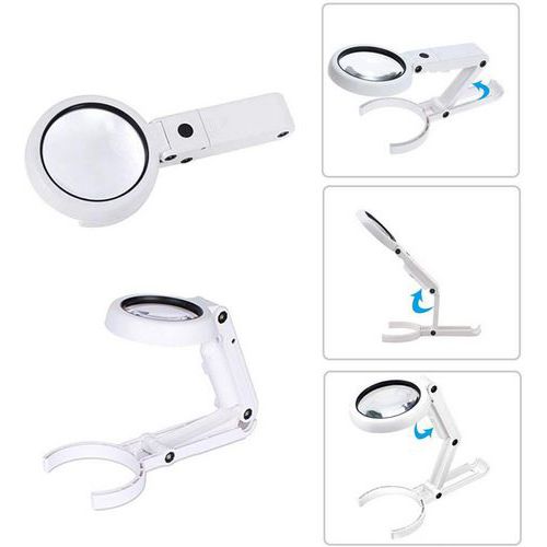 Cette loupe peut être utilisée de deux manières : elle peut se tenir dans la main comme une loupe normale, ou bien il vous suffit de l'étirer et de l'utiliser comme une lampe de table.