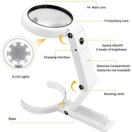 Lumineuse : 8 LED à haute efficacité énergétique sont incorporées dans cette loupe, elles vous offrent une lumière brillante qui vous permet de travailler dans l'obscurité.