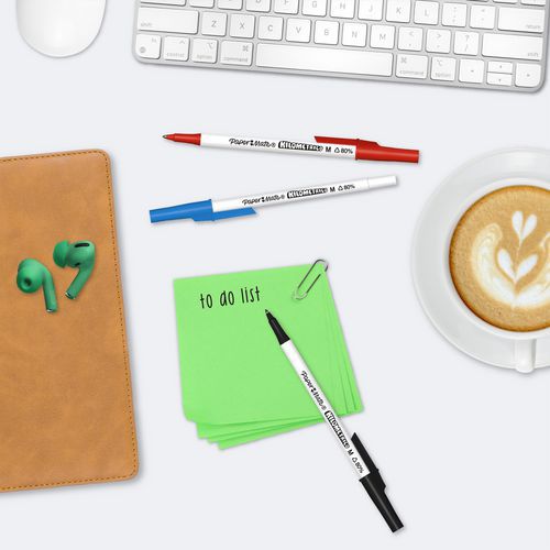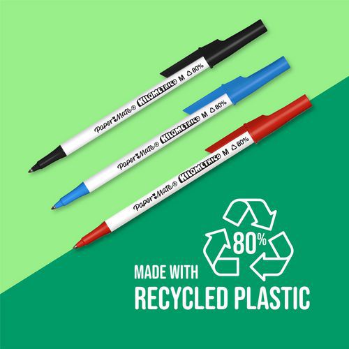 Fabriqués à partir de 80 % de plastique recyclé, les stylos bille Paper Mate® Kilometrico garantissent une écriture fiable et fluide, quelle que soit la situation. Disponibles avec de l’encre noire, bleue et rouge et une pointe moyenne 1,0 mm pour un aspect solide et professionnel.
