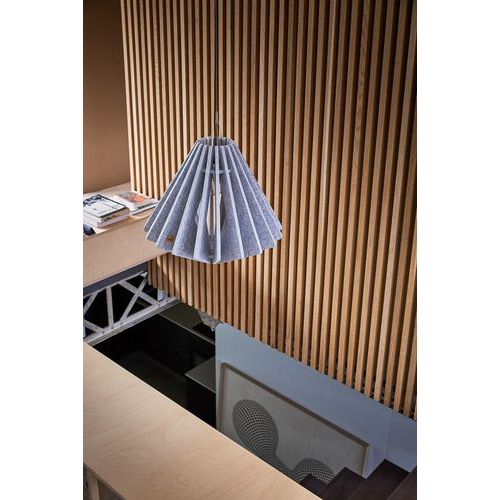 Luminaire acoustique au design iconique et élégant. Coloris chics et intemporelles. Eclairage Standard : douille culot E27. Performance acoustique certifiée : αw= 0,85 - Class B - PV en alpha w. Transport à plat. Montage simple et rapide.