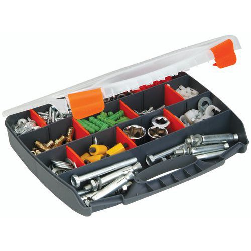 Mallette à séparateurs, facilement transportable avec 2 fermoirs au niveau de la poignée. Les compartiments peuvent être divisés en 25 petits compartiments avec des séparateurs amovibles. Couvercle transparents pour identifier rapidement le contenu.
