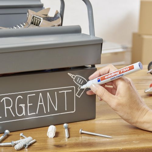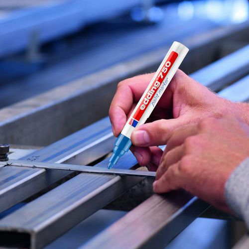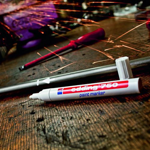 Marqueur peinture - Edding 750 pour une écriture très couvrante et permanente même sur des matériaux foncés et transparents. Marquage sur le métal, le verre, le plastique etc .. et en particulier toutes les surfaces lisses. Séchage rapide de la peinture, faible odeur. Résistant à l’eau, à la lumière, à la chaleur jusqu’à 400°c ( 1000°c pour certaines couleurs comme le blanc, jaune, argent) et résiste à l’abrasion. Débit d’encre modulé par la valve du marqueur. Sans toluène / xylène.