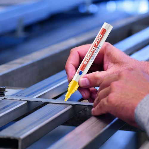 Marqueur peinture - Edding 750 pour une écriture très couvrante et permanente même sur des matériaux foncés et transparents. Marquage sur le métal, le verre, le plastique etc .. et en particulier toutes les surfaces lisses. Séchage rapide de la peinture, faible odeur. Résistant à l’eau, à la lumière, à la chaleur jusqu’à 400°c ( 1000°c pour certaines couleurs comme le blanc, jaune, argent) et résiste à l’abrasion. Débit d’encre modulé par la valve du marqueur. Sans toluène / xylène.