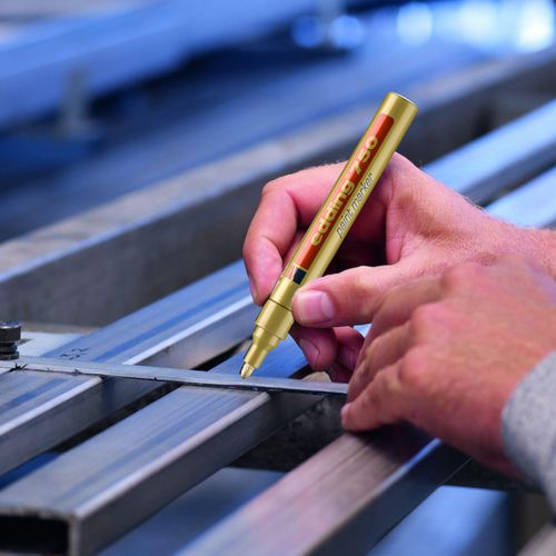 Marqueur peinture - Edding 750 pour une écriture très couvrante et permanente même sur des matériaux foncés et transparents. Marquage sur le métal, le verre, le plastique etc .. et en particulier toutes les surfaces lisses. Séchage rapide de la peinture, faible odeur. Résistant à l’eau, à la lumière, à la chaleur jusqu’à 400°c ( 1000°c pour certaines couleurs comme le blanc, jaune, argent) et résiste à l’abrasion. Débit d’encre modulé par la valve du marqueur. Sans toluène / xylène.