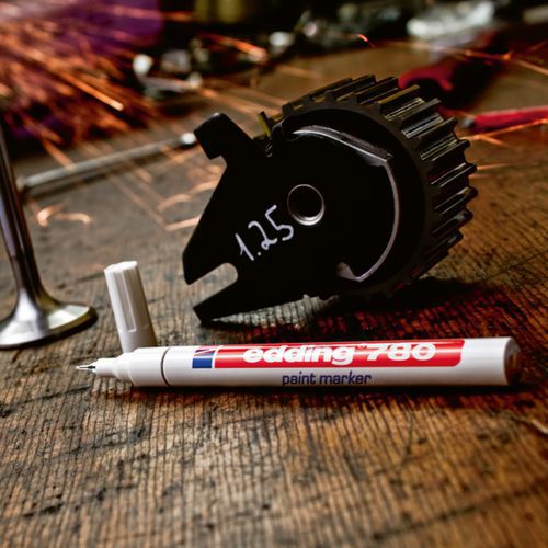Marqueur peinture - Edding 780 pour une écriture très couvrante et permanente même sur des matériaux foncés et transparents. Marquage sur le métal, le verre, le plastique etc .. et en particulier toutes les surfaces lisses. Séchage rapide de la peinture, sans odeur. Résistant à l’eau, à la lumière, à la chaleur jusqu’à 400°c ( 1000°c pour certaines couleurs comme le blanc, jaune, argent) et résiste à l’abrasion. Débit d’encre modulé par la valve du marqueur.