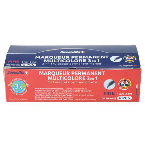 | Intitulé du produit | Marqueur permanent 3 couleurs pointe rechargeable, Encre coloris: Assorti, Corps matériau: PVC |