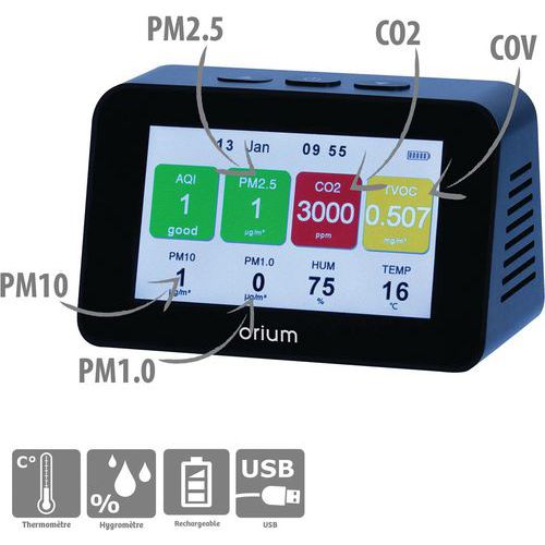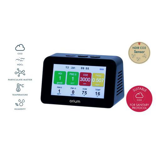 | Intitulé du produit | Mesureur intérieur de CO2, Fixation murale: non, Paramètre mesuré: CO2, Température mesurée maxi: 50 °C |