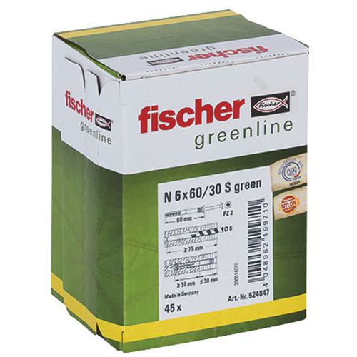 | Intitulé du produit | Cheville à frapper N Green 6 60 30 S, Cheville longueur: 60 mm, Ø: 6 mm, Matériau: Nylon |