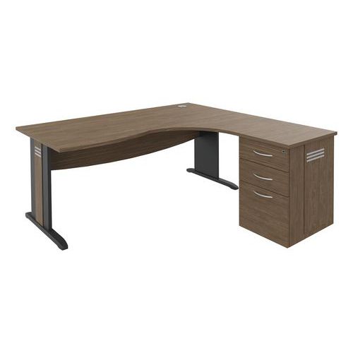 Pack Quatuor composé d'un bureau asymétrique retour à droite et d'un caisson hauteur bureau offrant un grand espace de travail Plateau panneau de particules épaisseur 25 mm. Pieds L base bois avec parement sérigraphié. Vérin de réglage sur pieds et caisson hauteur bureau. Bureau avec voile de fond et obturateur passe câbles sur plateau. Bureau retour à droite profondeur 120 cm équipé de vérins de réglage d'aplomb. Bureau asymétrique livré prêt à monter avec notice. Caisson hauteur bureau livré monté composé de 3 tiroirs dont 1 pour dossiers suspendus. Caisson avec serrure centralisée avec clé pliante. Plumier amovible dans tiroir haut. L/H/P caisson : 43 x 72 x 60 cm.
