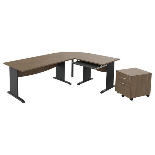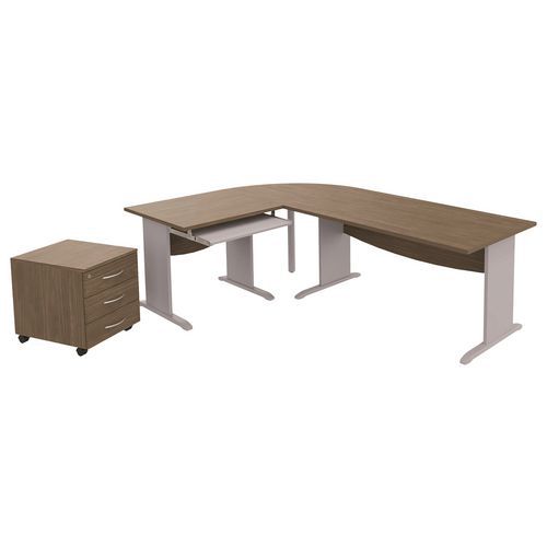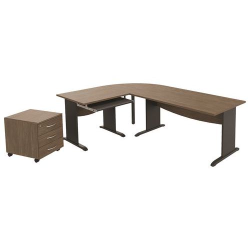 Pack bureau Mercure avec retour positionnable à droite ou à gauche au choix au moment du montage. Ce pack est composé d'un bureau droit L 160 cm, d'un angle à 90°, un bureau droit L 80 cm et d'un caisson mobile. Plateau panneau de particules bois épaisseur 25 mm surfacé mélaminé. Plateau hauteur 72 cm, profondeur 80 cm. Bureau équipé d'un voile de fond réversible (1 côté courbe, 1 côté droit). Piètement en L dégageant l'accès avec base bois massif laqué. Vérins de réglage d'aplomb. Angle 90° avec pied métal Tablette support clavier réglable en hauteur L/P : 64,5 x 36 cm Caisson mobile panneau mélaminé décor coloris bois. Bureaux livrés prêts à monter avec notice.