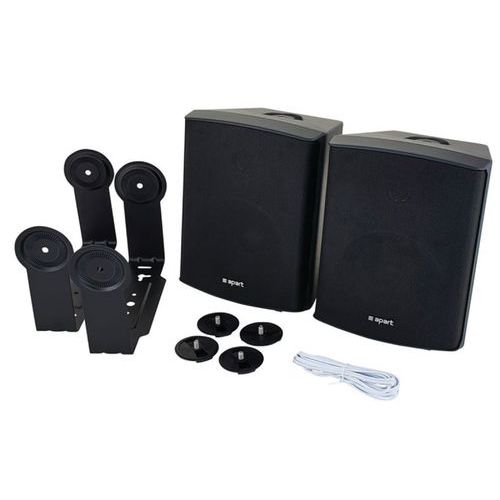 Ensemble composé de 2 enceintes compactes dont une active (amplification 2 x 30 W) et une passive reliée par un simple câble haut-parleur.